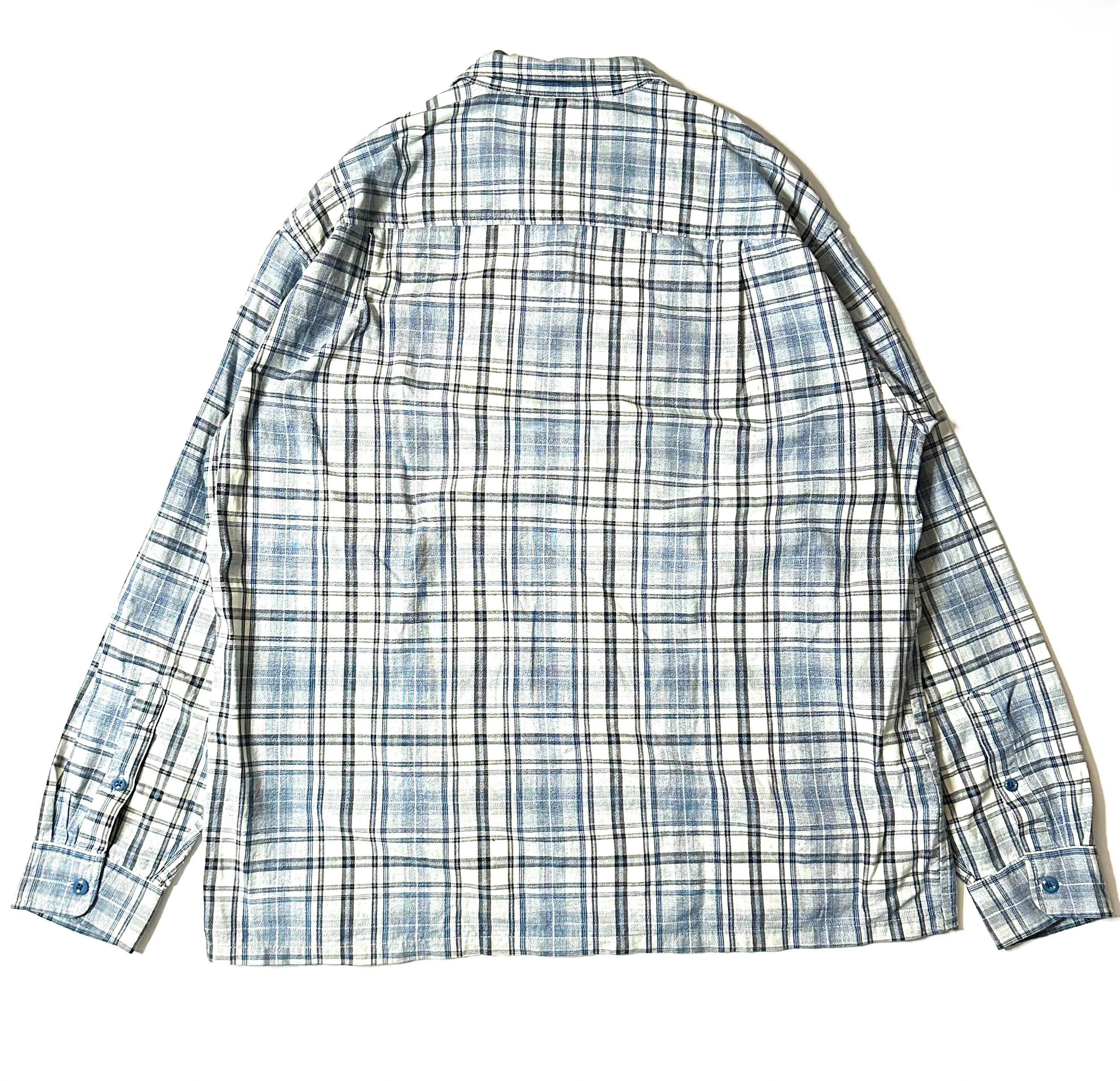 若干シャドーチェックになっており、ボックスシルエットで爽やかなブルーとホワイトの色味もよく一枚で様になるシャツです。