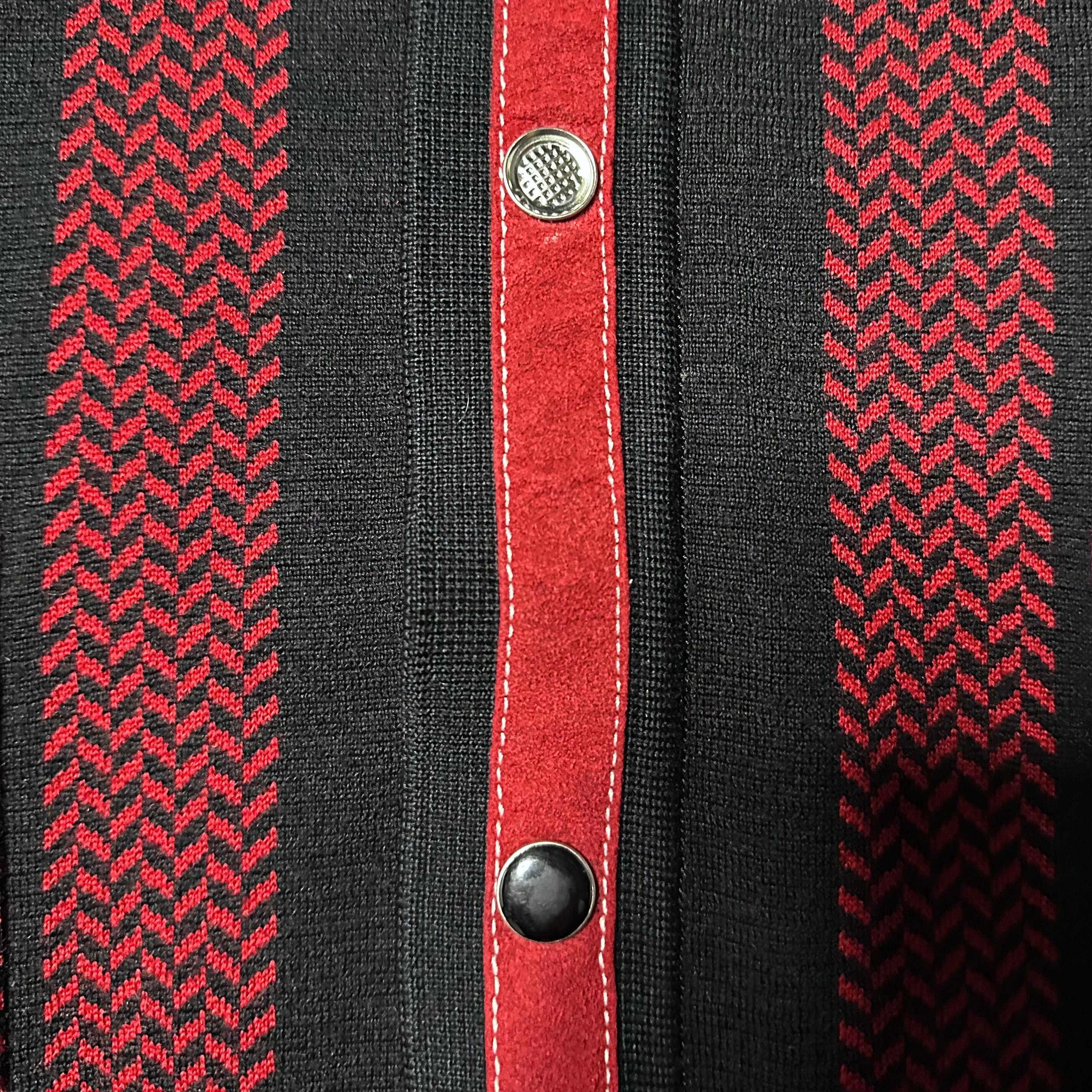 ブラックをベースにレッドのラインが映えるバイカラーデザインでフロントには、複雑に編み込まれたヘリンボーン調の幾何学模様が施されておりかっこいいです。