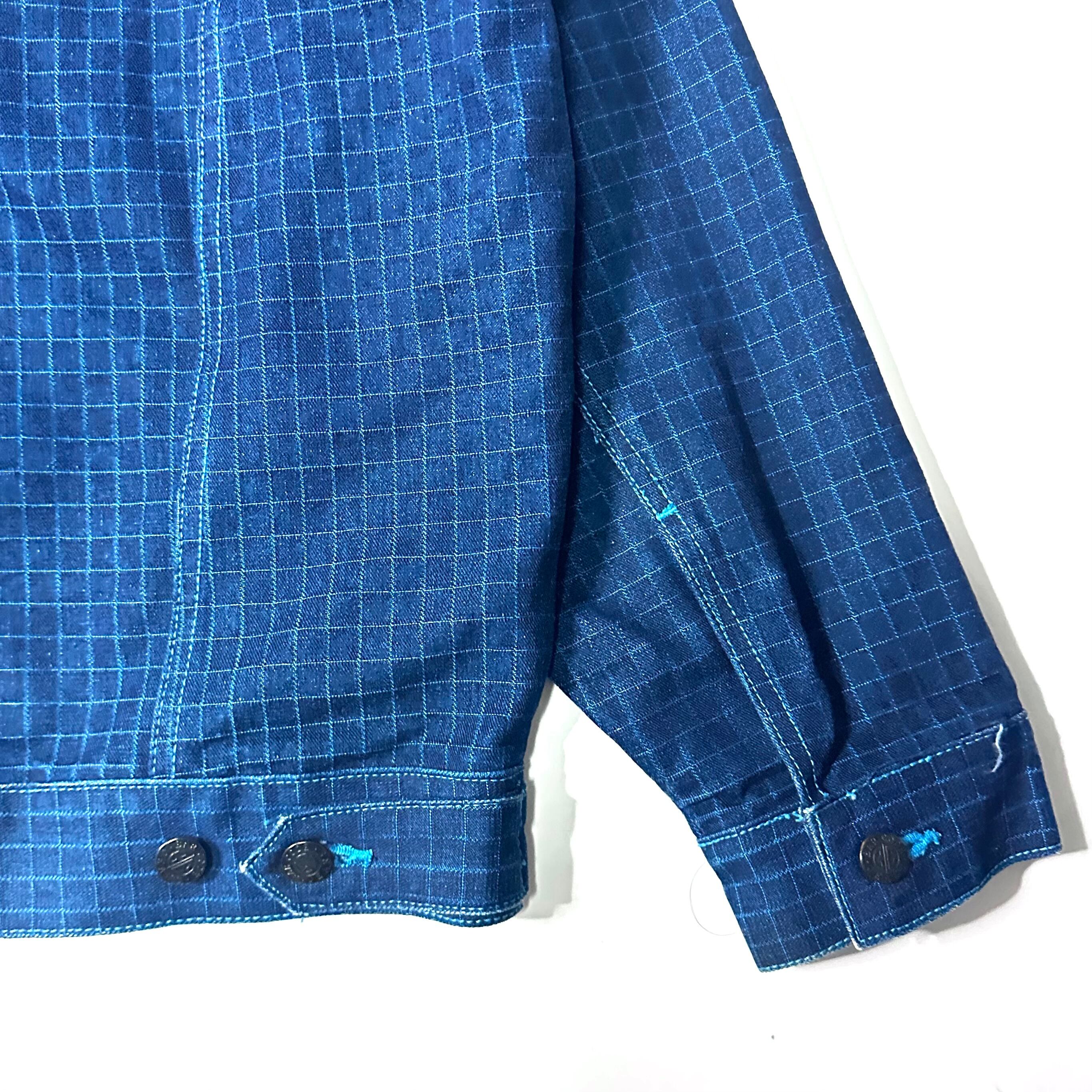 濃紺のデニム地に、水色の細かな格子状のステッチ